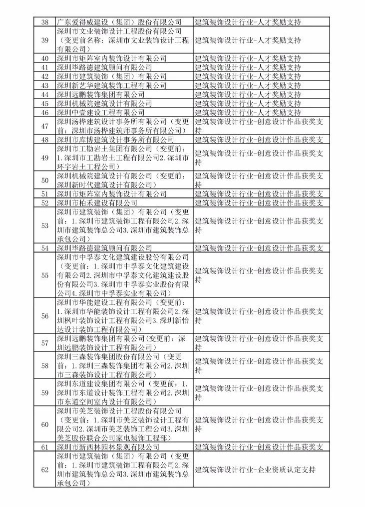 核心提示:2018年9月25日,福田企服中心公布了2018年福田區(qū)產(chǎn)業(yè)發(fā)展專項(xiàng)資金文化產(chǎn)業(yè)分項(xiàng)第一批支持企業(yè)及項(xiàng)目匯總表。其中,深圳中壹建設(shè)工程有限公司、深圳遠(yuǎn)鵬裝飾集團(tuán)有限公司、深圳東道建設(shè)集團(tuán)有限公司等建筑裝飾企業(yè)獲得該項(xiàng)專項(xiàng)資金支持。支持項(xiàng)目類別有建筑裝飾設(shè)計(jì)行業(yè)——綜合貢獻(xiàn)支持、人才獎(jiǎng)勵(lì)支持、創(chuàng)意設(shè)計(jì)作品獲獎(jiǎng)支持、企業(yè)資質(zhì)認(rèn)定支持。