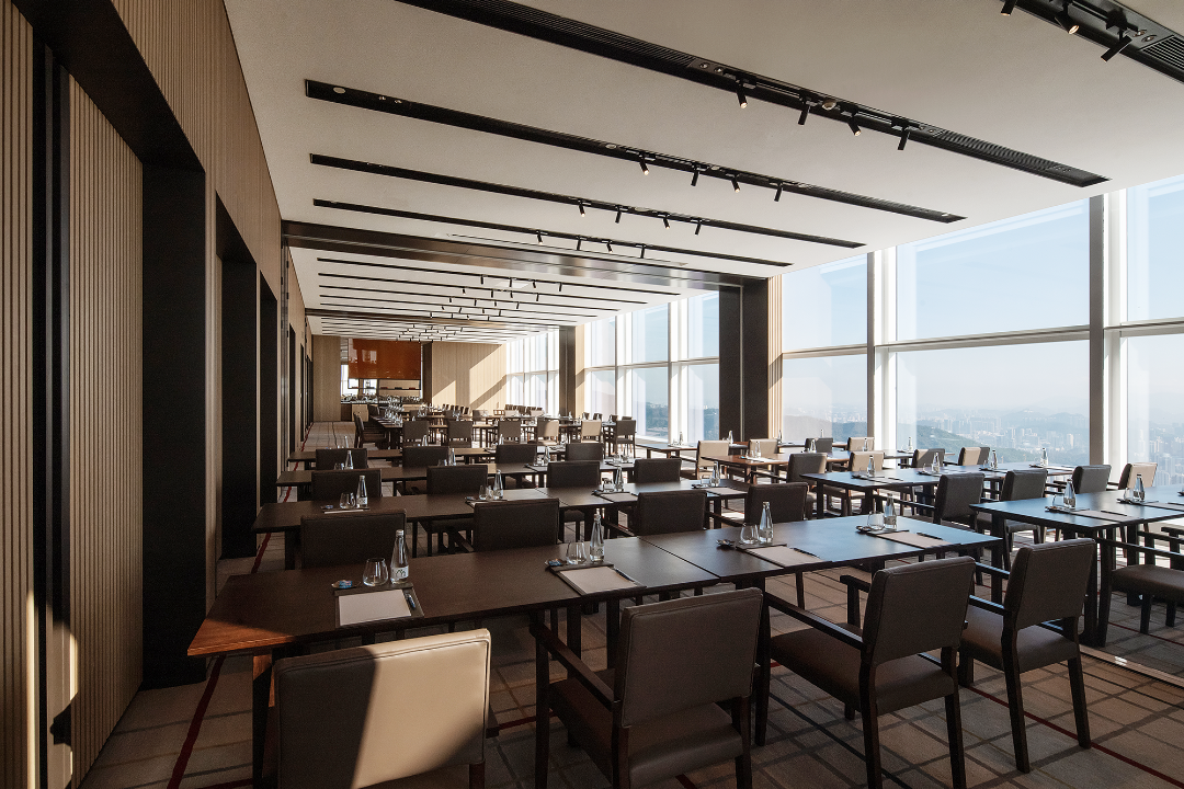 深業上城文華東方酒店配有一系列專屬會議場地和活動空間,77F的會議廳就是其中的典型代表。會議廳外側走廊采用毛坯磚式設計,其上繪有一幅特色壁畫;廳內則以棕褐色為主色調,融合風格前衛的落地玻璃窗設計,鋪設灰底多色條紋地毯,呈現出傳統又不失前衛的典雅氣韻,為品味獨到的策劃者提供理想的會議空間。