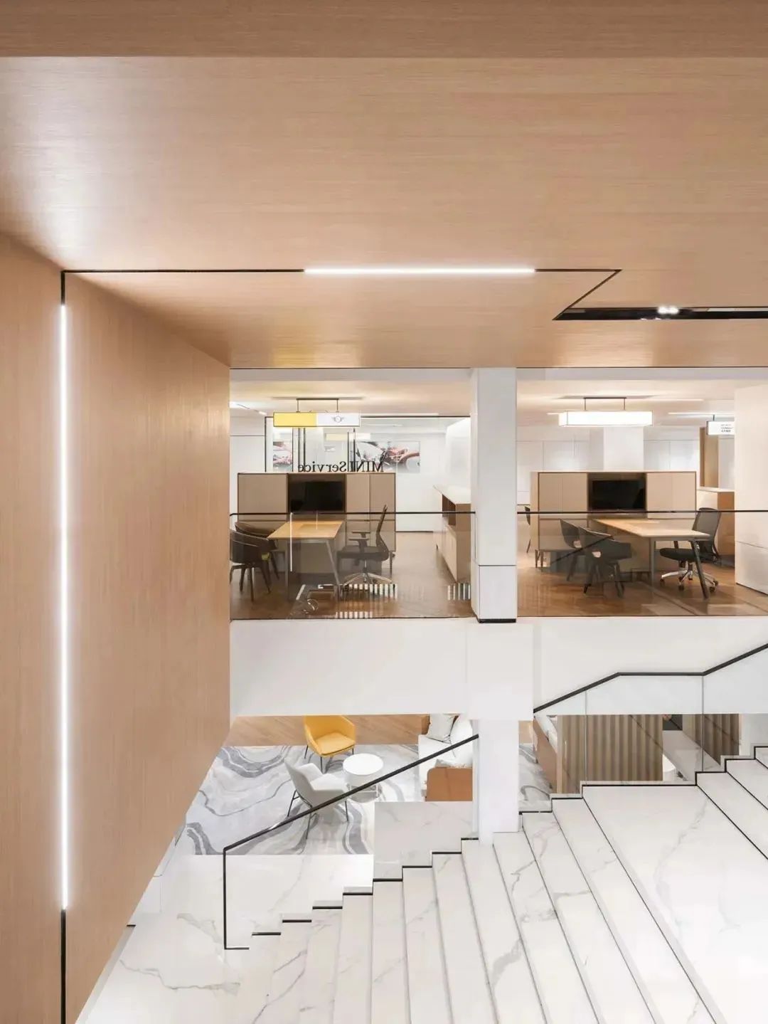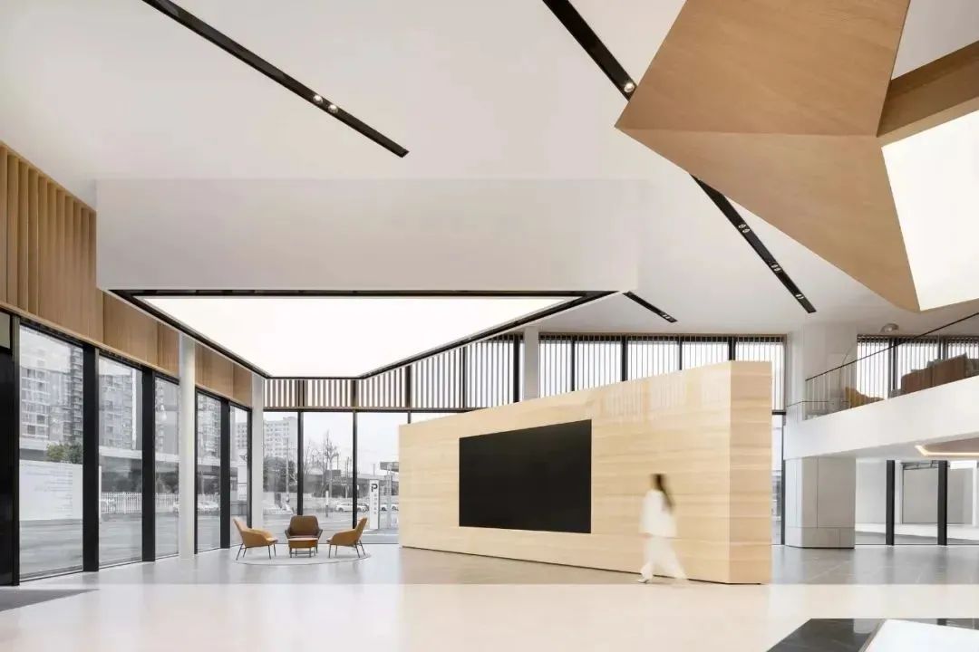 本項目注重“公共性”和“開放性”,將建筑景觀界面延伸交錯的線性延伸至室內天花、吧臺、樓梯斜切面,統一的線性交錯特征,打破了功能空間的固定關系,將不同屬性的功能空間聯系起來,形成室內與戶外的互動對話。